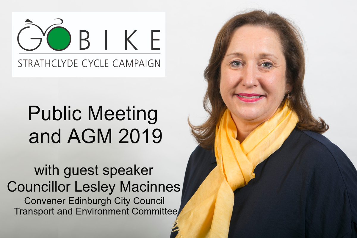 Our 2019 Public Meeting and AGM is only 1 week away, next Saturday, 16th November. This year we are extremely pleased that Councillor Lesley Macinnes, Convener Edinburgh City Council Transport and Environment Committee, will be our Guest Speaker. This will provide us with an opportunity to understand what is being planned for Edinburgh, the issues they are facing and what lesson could be learned for Glasgow.