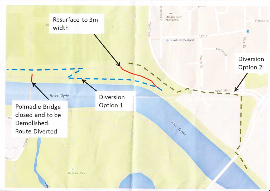 Glasgow City Council have informed us that the diversion route for the closed Polmadie Bridge, on the north side of the Clyde in Glasgow Green, is to be upgraded. The rough, narrow track down the bank from the car park is to be surfaced to a width of 3m with tarmac. There is also the potential of a planter being placed at the top of the bank to prevent car parking blocking the track.